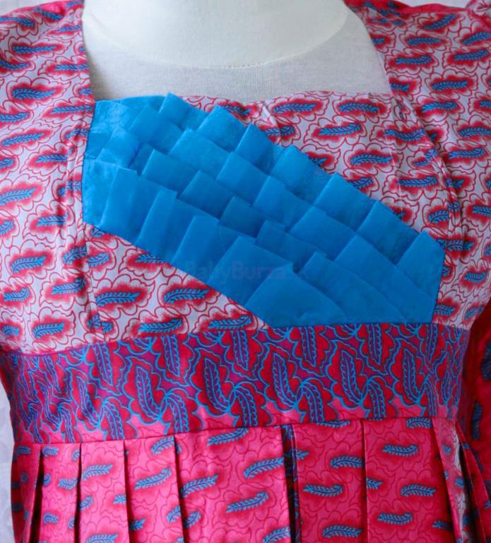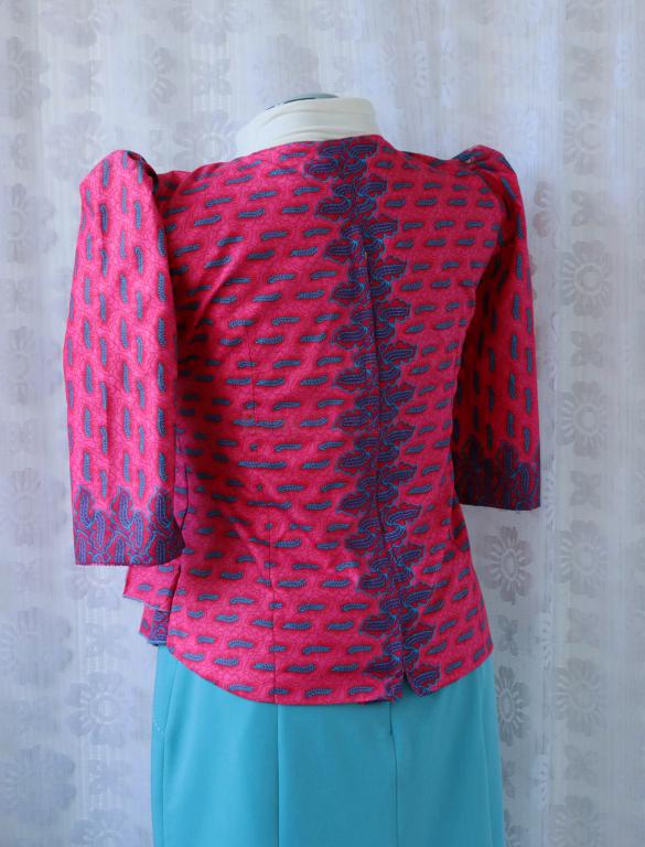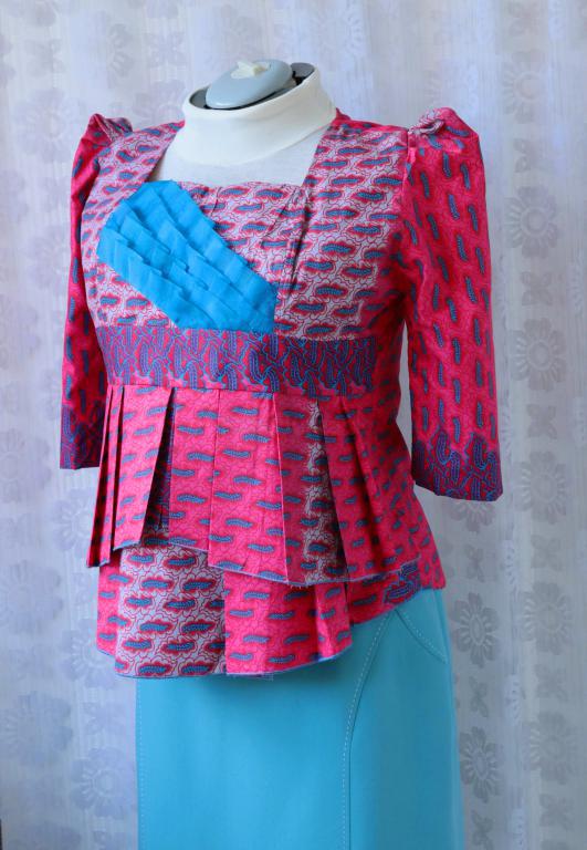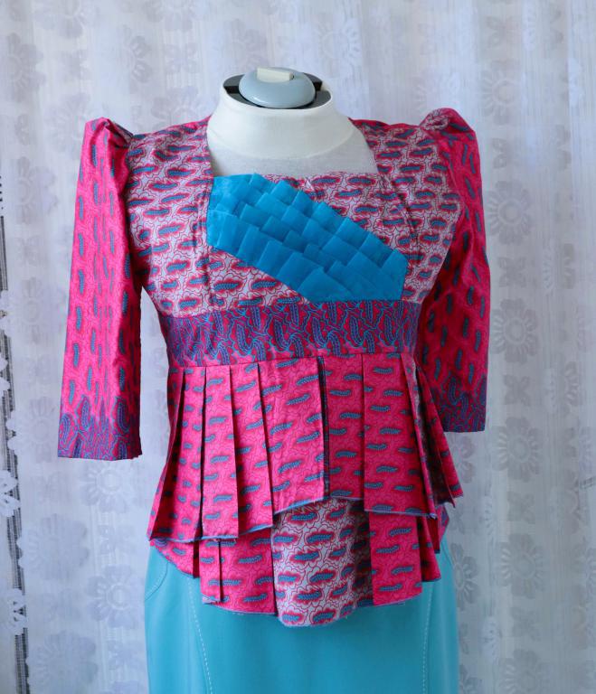 Kvalitne vypracovaná tehotenská blúzka z krásnej farebnej tkaniny, pravdepodobne bavlny. Pomerne pevný materiál ktorý drží tvar, šírka je zaručená skladmi ktoré se od pŕs rozširujú, chrbát je vypasovaný. Vpredu apartná tylová skladaná aplikácia. Polovičný rukáv v ramene nabraný. Zapínanie na zips na chrbáte, otvára sa obrátene odspoda nahor a končí niekoľko cm od výstrihu. Veľmi originálny kúsek, vhodný aj do spoločnosti. Top stav - nová. Veľkosť uvádzam orientačne, prosím radšej merajte, ramená 42 cm, prsia 116 cm, dĺžka rukáva 46 cm, dĺžka živôtika 28 cm, šírka prepásania 6 cm, celková dĺžka 60-65 cm predok, chrbát 62 cm. Poštovné alebo Zásielkovňa 2,5€.