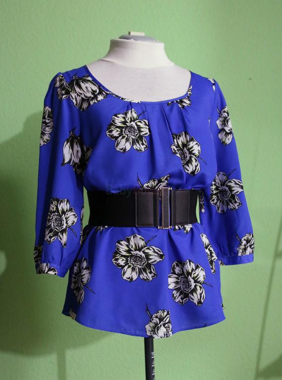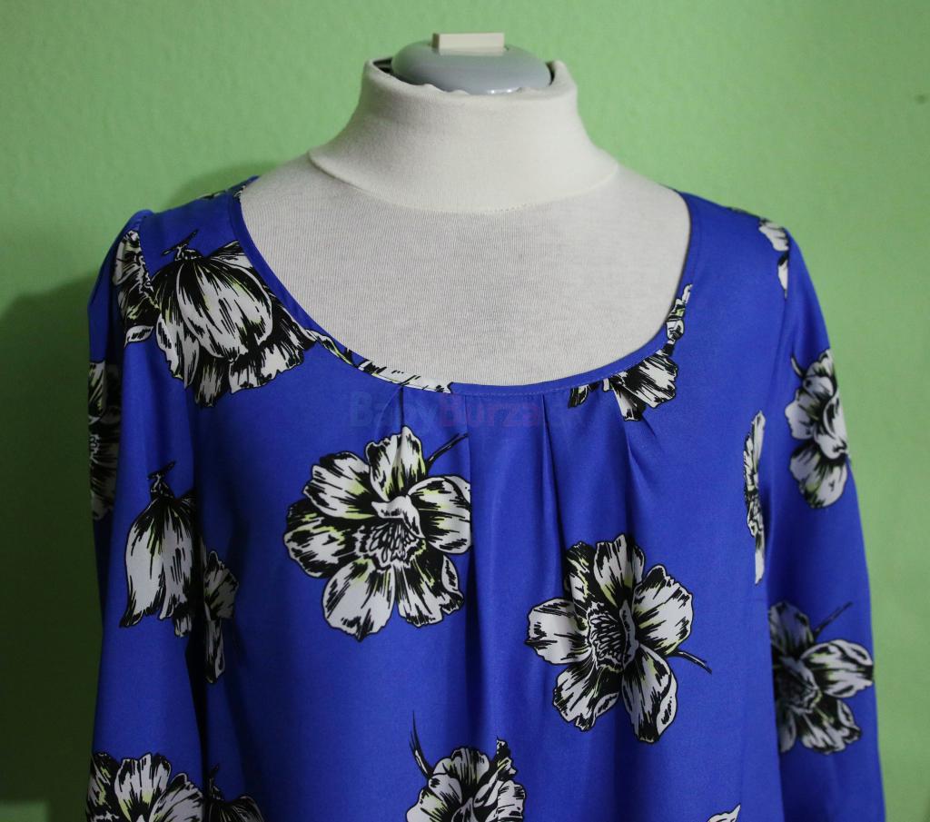 Krásne modrá blúzka s bielymi kvetmi zn.George, voľný strih, najmä vpredu vďaka nariaseniu u výstrihu, vzadu skôr priliehavá, rukáv 3/4. Dá sa nosiť ako tehotenská, vpredu je mierne predĺžená, ale len o pár cm. Vzadu zapínanie na slzičku a gombík, náhradný ešte prišitý na štítku. Vynosíte aj s opaskom ako bežnú blúzku - posledné foto. Materiál nepruží, 100% polyester. Rozmery rada zašlemu. Stav - nová. Pošta 2,5€ pri platbe vopred.